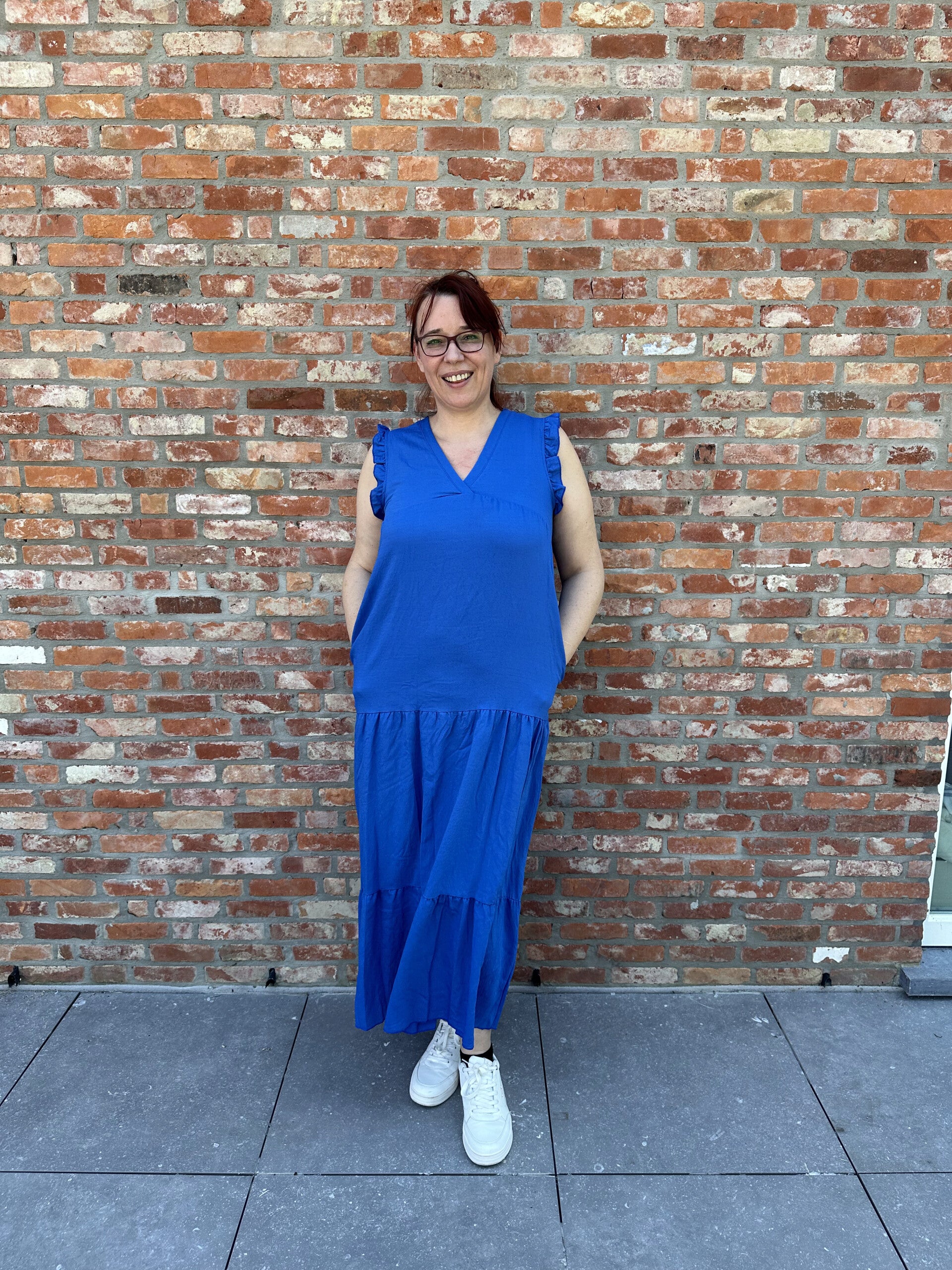 Onze summer dress cobalt komt in one size en kan gedragen worden tot maat 44.