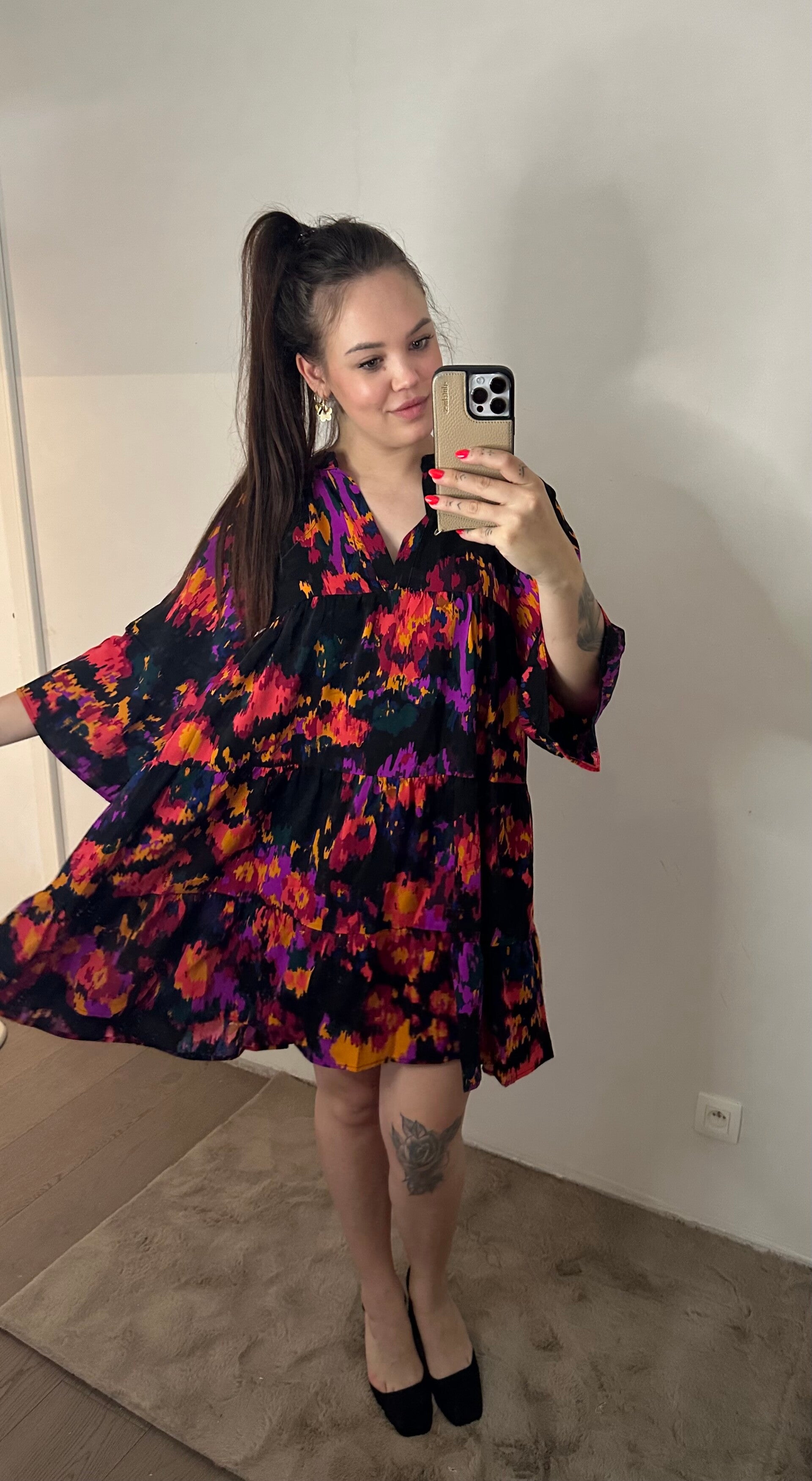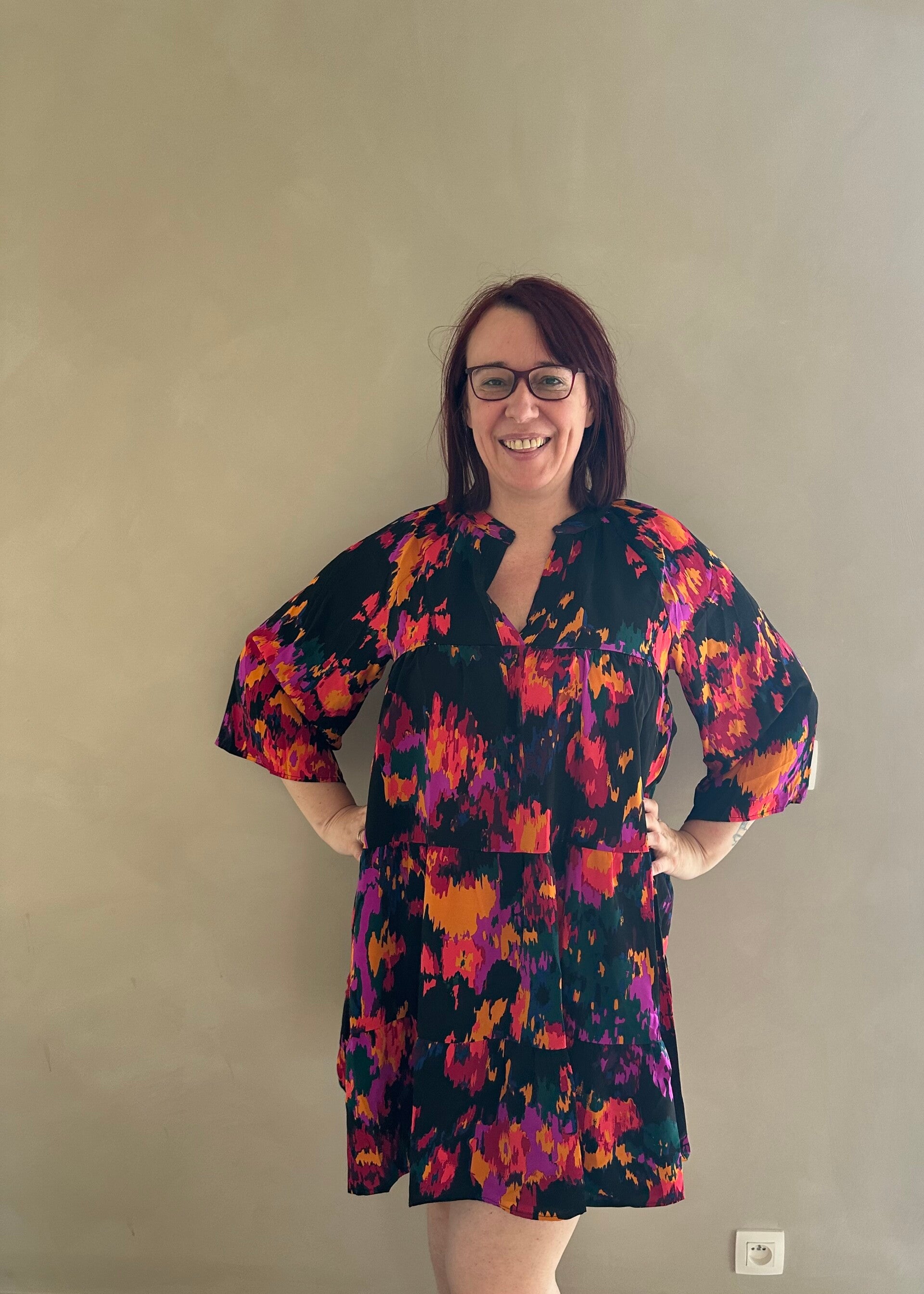 Onze Ella dress is een heel fleurige jurk met een zeer losse pasvorm. valt aan de achterkant iets langer.