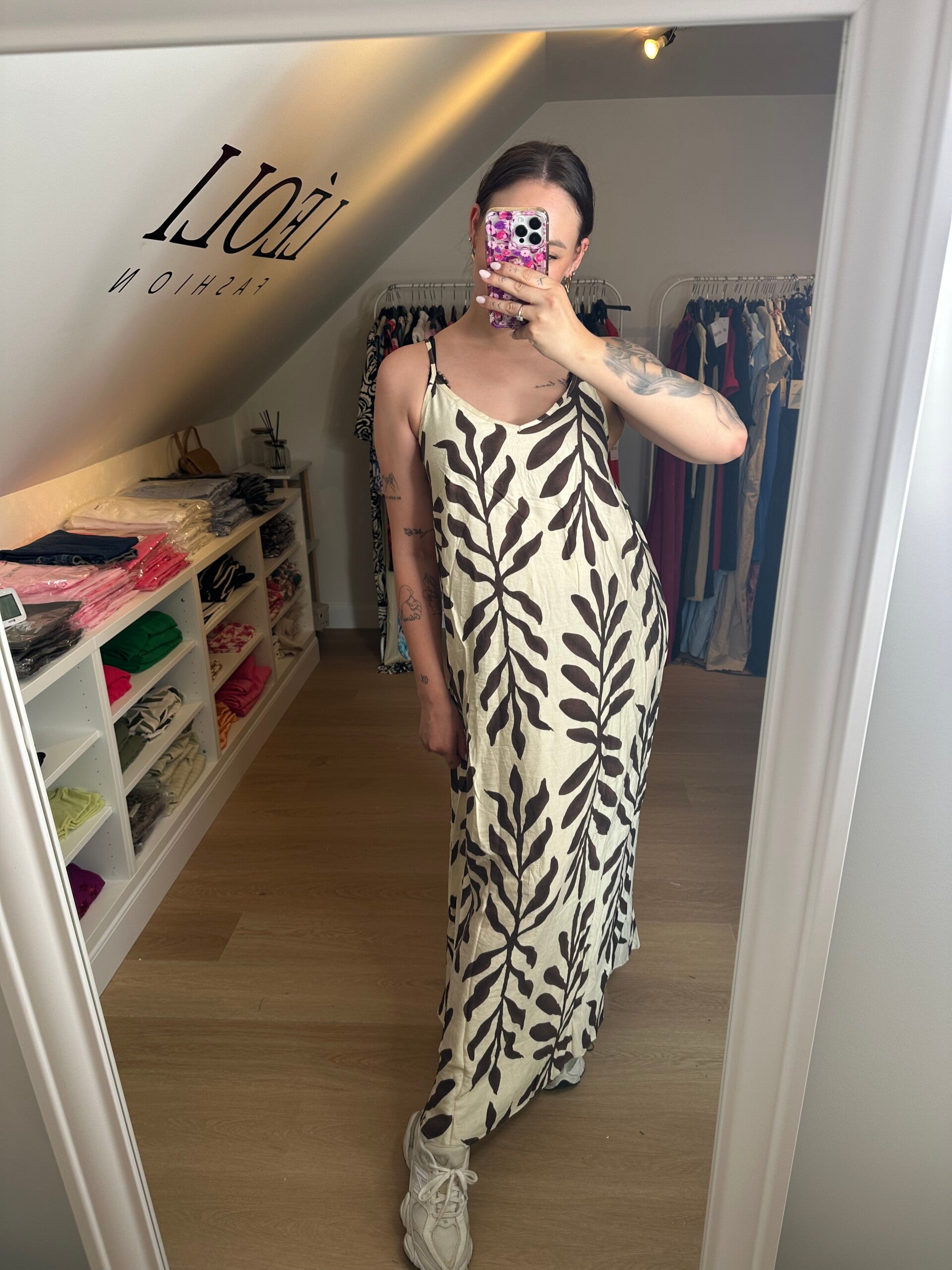Onze Rosa dress is een lange jurk met een losse pasvorm, de bandjes zijn verstelbaar, komt is een one size en kan tot maat 44.